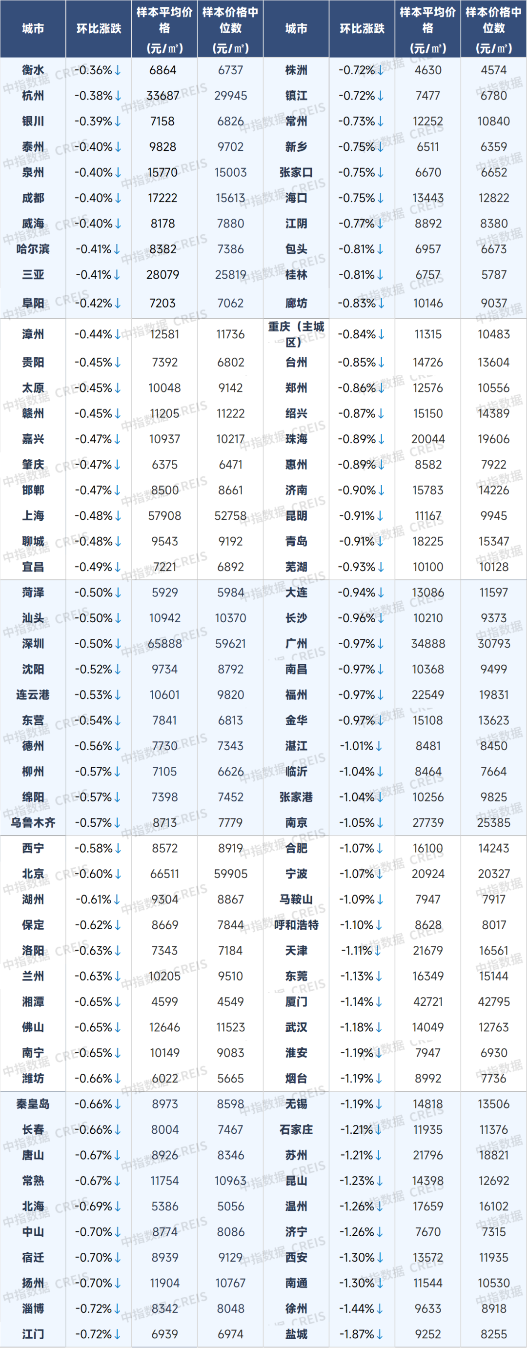我们来看看四大一线城市都跌了多少,上海跌0.48%,深圳跌0.5%,北京跌0.6%。最夸张的是广州,跌0.97%,几乎是贴着1%在跌。