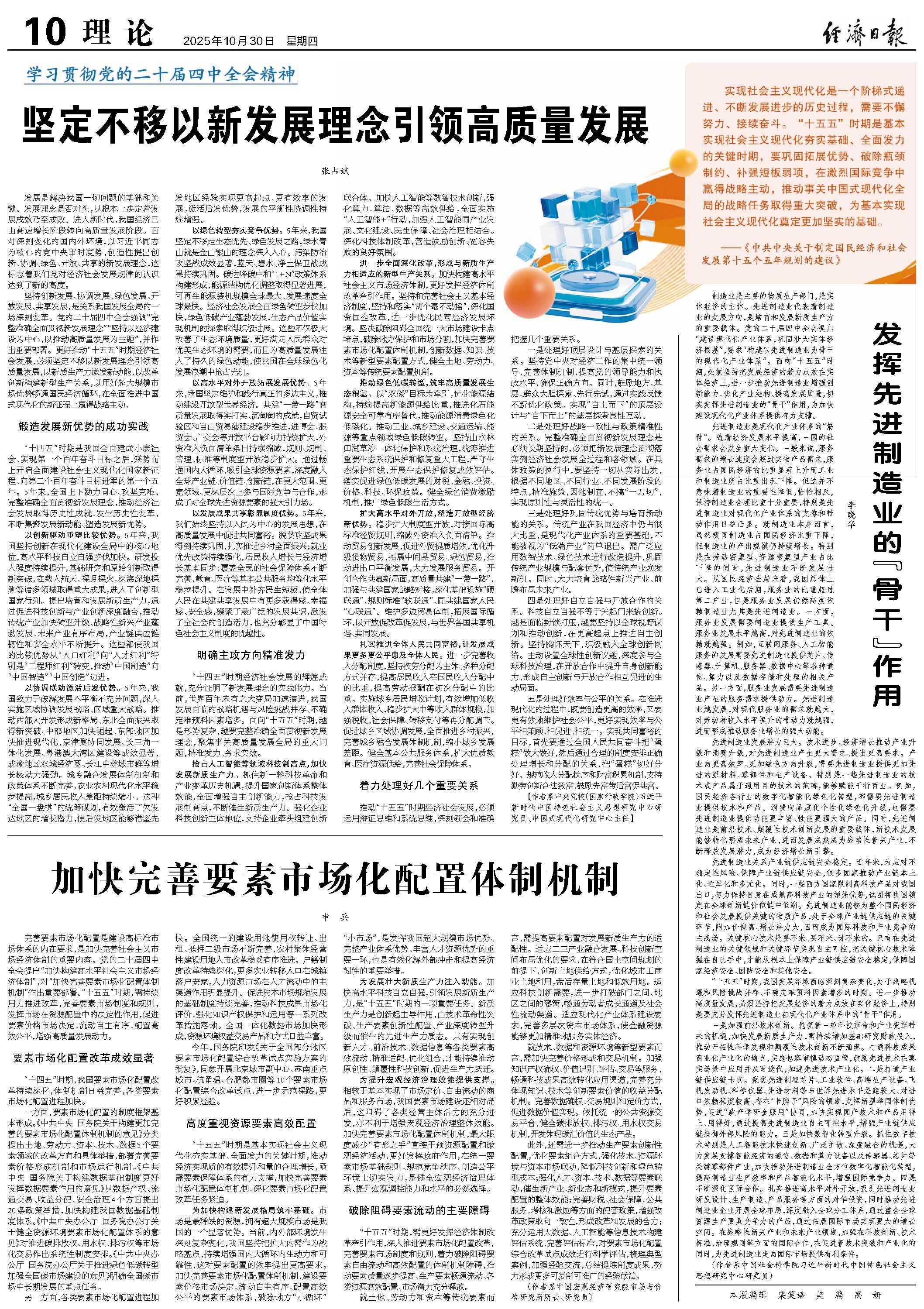 坚持创新发展、协调发展、绿色发展、开放发展、共享发展,是关系我国发展全局的一场深刻变革。党的二十届四中全会强调“完整准确全面贯彻新发展理念”“坚持以经济建设为中心,以推动高质量发展为主题”,并作出重要部署。更好推动“十五五”时期经济社会发展,必须坚定不移以新发展理念引领高质量发展,以新质生产力激发新动能,以改革创新构建新型生产关系,以用好超大规模市场优势畅通国民经济循环,在全面推进中国式现代化的新征程上赢得战略主动。