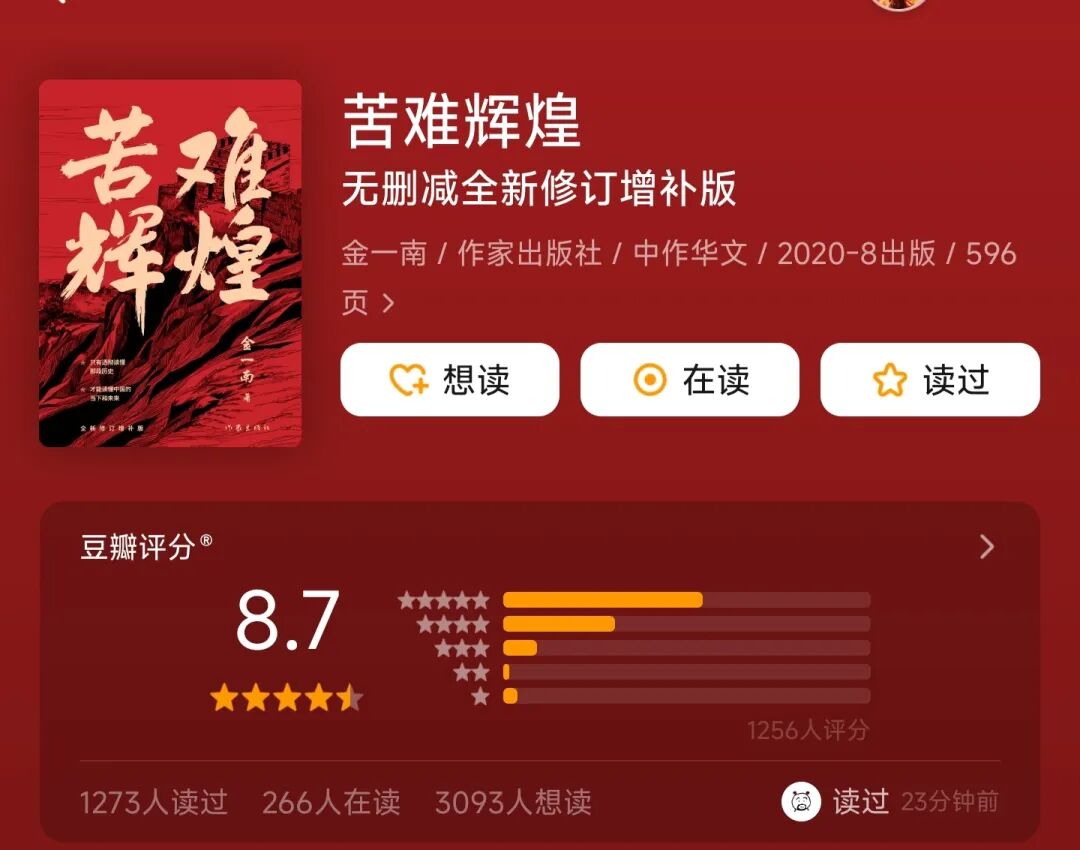 那像金一南教授这书《苦难辉煌》对我而言,也是同样的道理。他刺激和点燃了我对黨史的強烈兴趣,也对我实现了一次深刻的精神洗礼和启蒙。